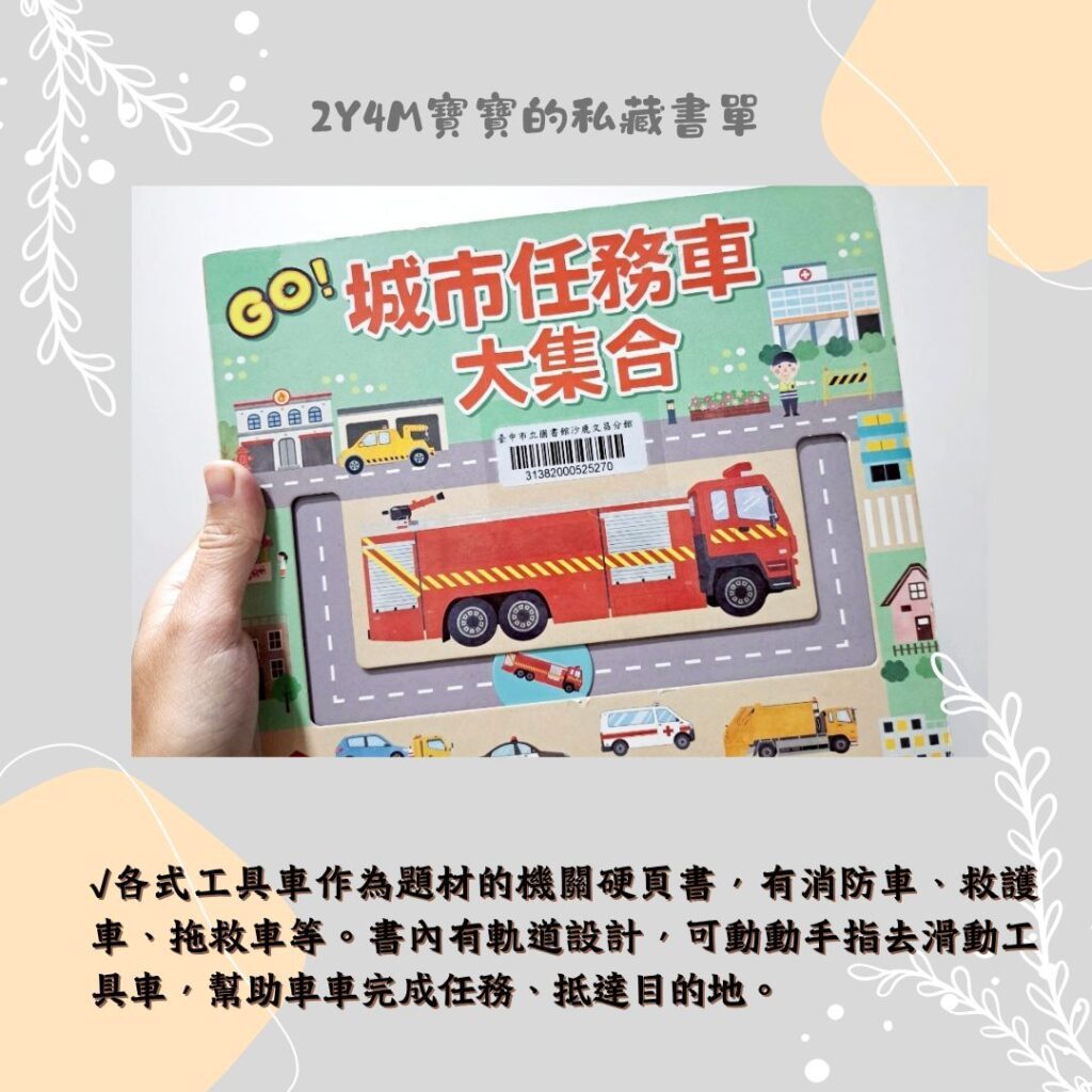 這本《GO!城市任務車大集合》是本以各式工具車作為題材的機關硬頁書,有消防車、救護車、拖救車等,非常有趣!