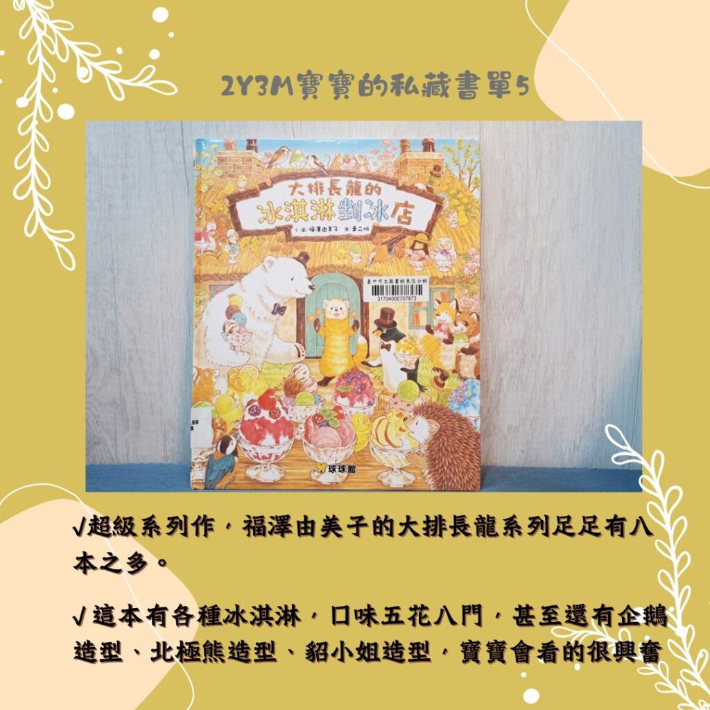 《大排長龍的冰淇淋剉冰店》中有各種冰淇淋,口味五花八門,甚至還有企鵝造型、北極熊造型、貂小姐樣貌的造型冰淇淋/剉冰,寶寶跟大人都會看的很興奮(感覺超級豐富,看完都好想吃吃看)。