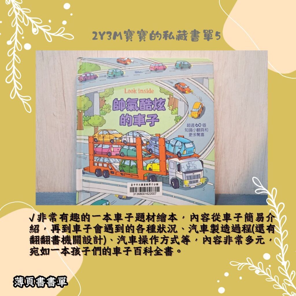 《帥氣酷炫的車子》非非常有趣的一本車子題材繪本,內容從車子簡易介紹,再到車子會遇到的各種狀況、汽車製造過程(還有翻翻書機關設計)、汽車操作方式等,內容非常多元,宛如一本孩子們的車子百科全書。