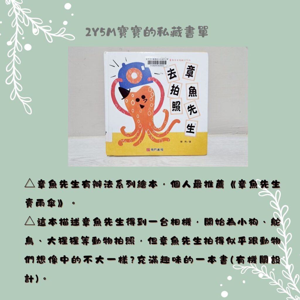 《章魚先生有辦法系列: 章魚先生去拍照》這本描述章魚先生得到一台相機,開始為小狗、鴕鳥、大猩猩等動物拍照,但章魚先生拍得似乎跟動物們想像中的不大一樣?充滿趣味的一本書(有機關設計)。