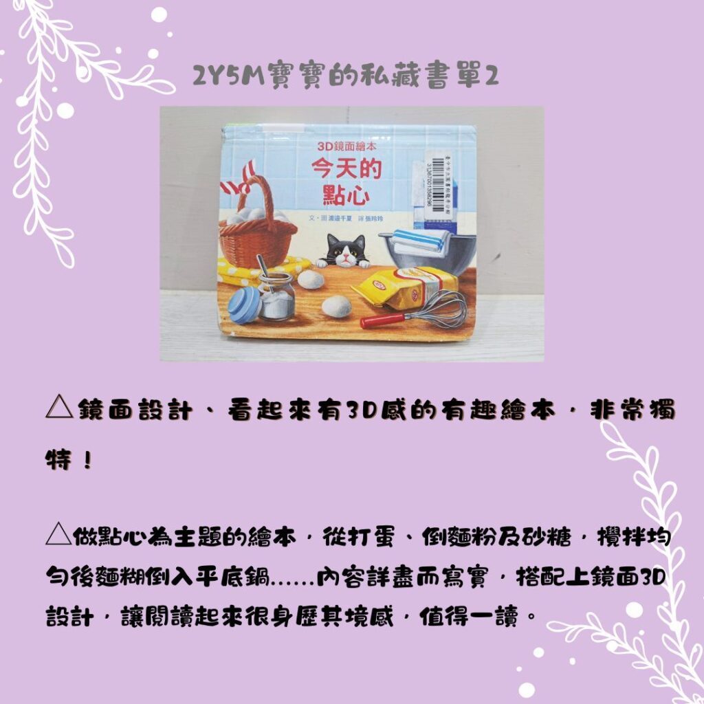 《今天的點心》是一本鏡面設計、看起來有3D感的有趣繪本,非常獨特!前陣子在IG上看到非常多育兒主題的帳號有分享這本,馬上被它主打的”3D感閱讀體驗”吸引住目光,立刻去圖書館借回來看看!