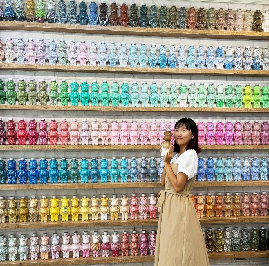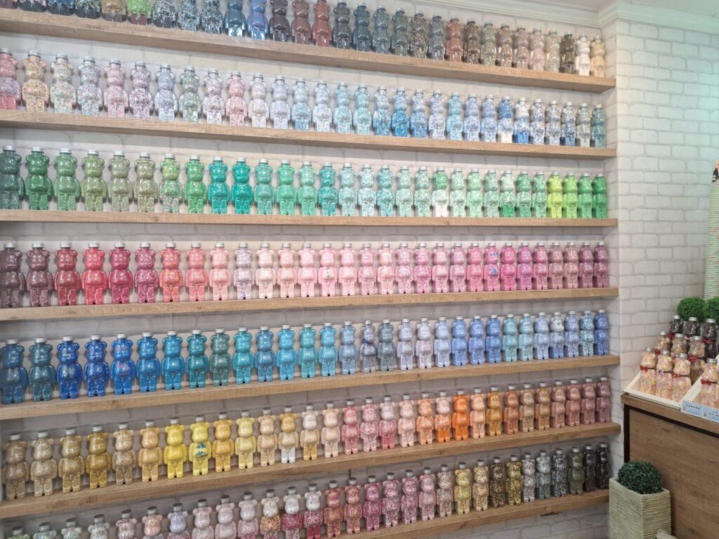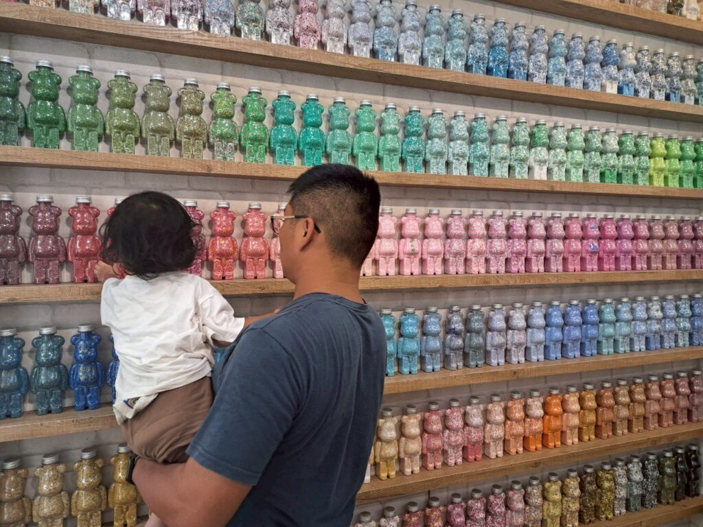 除此之外,來這裡絕對不能錯過的就是店內那面色彩繽紛的 「小熊牆」。牆上整齊排列著一隻隻造型可愛的小熊瓶子,每一隻都色彩鮮豔、超級繽紛,宛如色卡般、有著深淺變化,讓人忍不住駐足於前欣賞個好幾分鐘。
