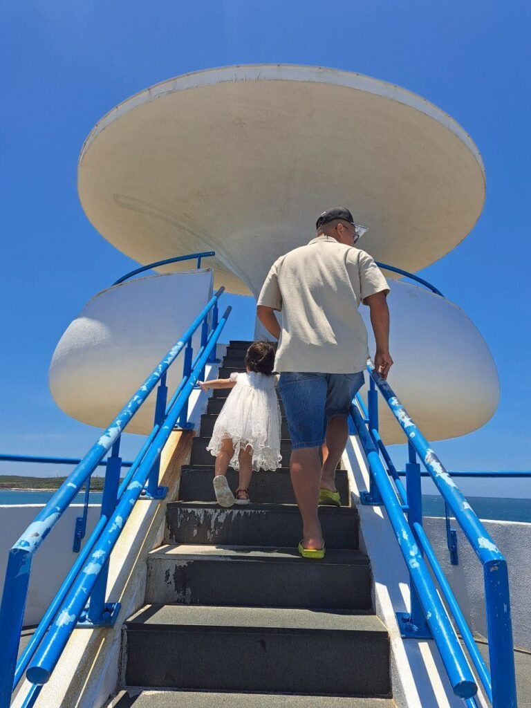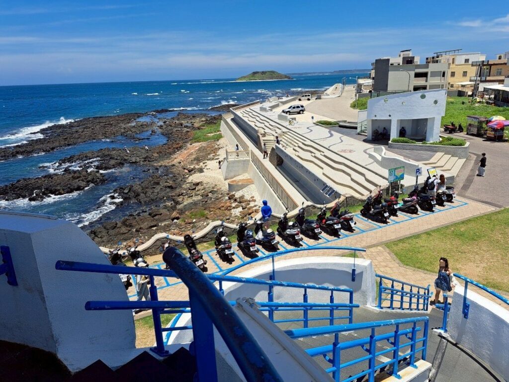 這個景觀平台名為風櫃聽濤,不得不說,它的外型設計真的很棒,乾淨俐落、沒有過多的顏色與花俏樣式,非常清爽、形狀又看起來有那麼點可愛。大面積的純白色,加上藍色的欄杆,美極了!