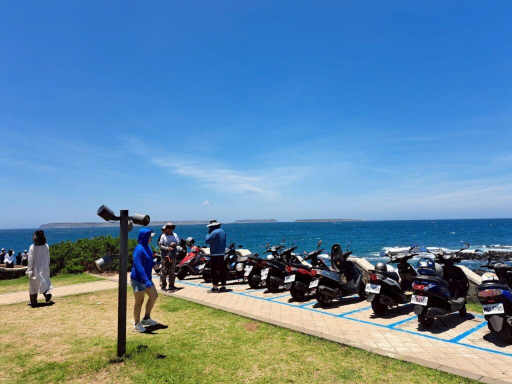 話說爬上去往下看,能看到停機車的地方,在其後就是一大片海景,這景色也是美得不得了,這大概是目前我看過最美的機車停車格了XD