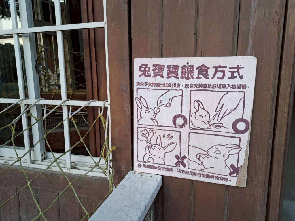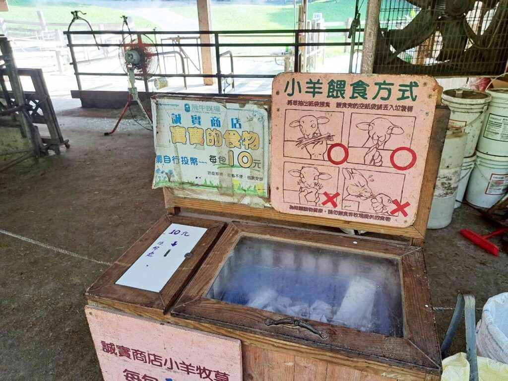 這個牧場的餵食方式指引圖都是採這個風格的繪風,超有趣。園區內很多飼料都是採誠實商店模式,就只有餵小鴨的一杓飼料、小羊的奶瓶是要跟櫃台員工購買的。
