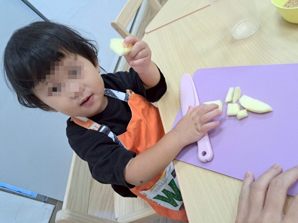 給寶寶用的刀具,都是安全刀具,適合寶寶用的。這次是切兩種水果,其中一個是蘋果,結果切沒幾塊,寶寶就不切了,開始他最大的興趣……吃蘋果!最後水果還沒切完,蘋果的部分就幾乎都被寶寶吃光了!(媽媽默默在旁邊接手切完剩下的部分)。