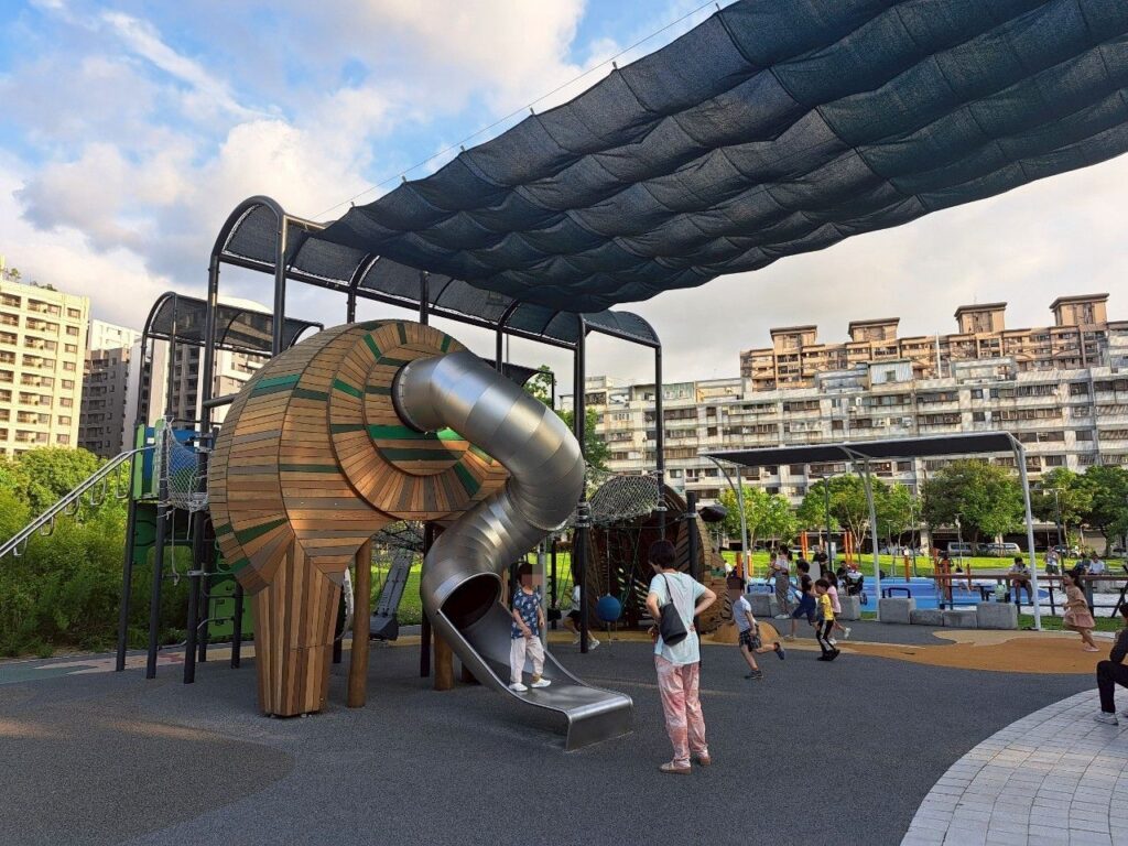 小豬尾巴是滑梯,這滑梯設計看起來也很厲害、九彎十八拐。不過這材質不知道夏天會不會熱(雖然上面有遮陽設施)。